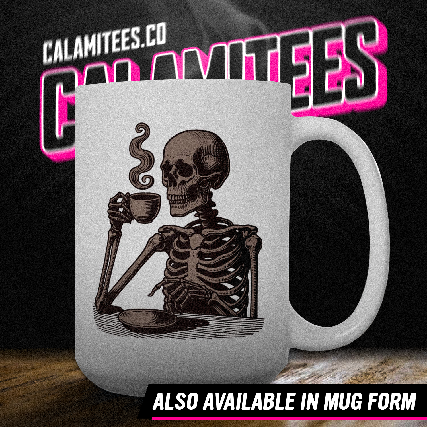 Skeleton Drinking Coffee (Vintage Style Graphic) T-Shirt Running on caffeine and existential dread. This vintage-style skeleton tee is perfect for mornings when you're dead inside but still need to show up.